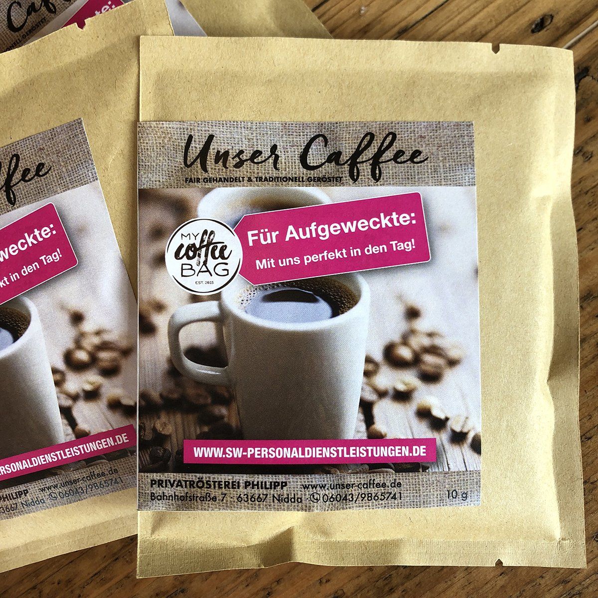 Unsere Coffeebags bedrucken wir auch für dich oder deine Firma mit individueller Werbung für dein Projekt oder mit einem Gruß.